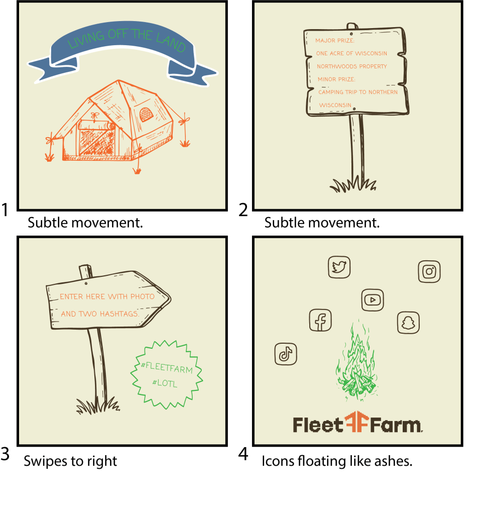 I chose Fleet Farm, an outdoors company from Wisconsin, and jumped it off by pumping out two key image ideas. The first is a nostalgic play on the “Fishy” game. Colorful, simply shaped, social media game oriented. Users could compete for prizes by playing this game on Fleet Farm’s site.