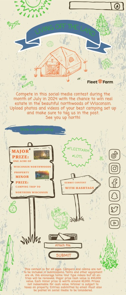 Pitch: Take photos and videos of your best camp site during July of 2024 and show us how you “Live Off The Land” in your own unique ways. The top prize winner will win one acre of northwoods property! This is prime real estate in the heart of the wilderness. Others have the chance to win an exciting trip up north in Wisconsin. There are $50,000 in total prizes! Find details through the button below.