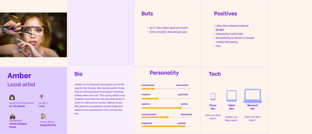 Solution: I want to get MAMA outside with the people and provide a fun activity for all ages. At the same time, we are looking to create an immersive experience, and that gives me a chance to think big. I want to incorporate VR and AR in a way that pushes the imagination but still offer a unique tangible experience that speaks to the mission of MAMA as an org.