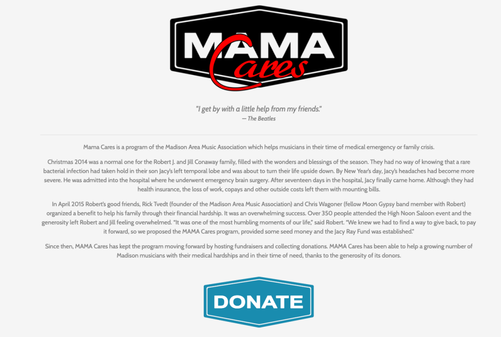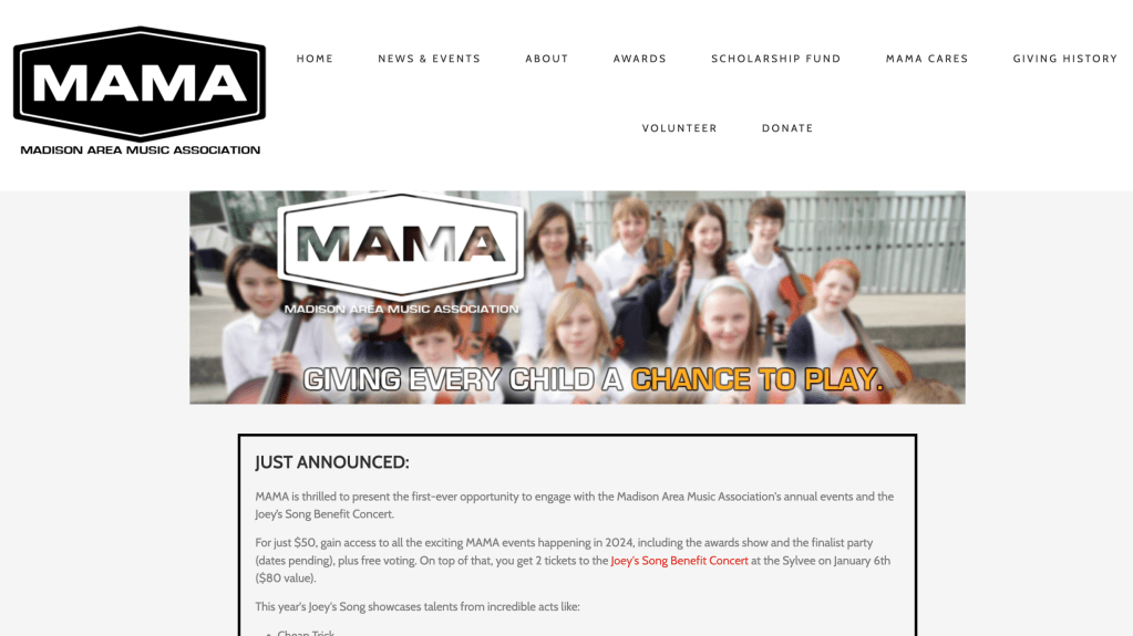 Problem: MAMA keeps their site minimalistic with imagery. They wrote a lot of informational content, which I appreciate, but it messes with the hierarchy. There is too much written content in comparison to images and graphics. This is a music organization and it should feature larger, vibrant graphics and images. They also need to get out into the community that they support and do some promotion. I do not think many people outside of the Madison area music community know that the organization exists or what it does. The site is not the focus but I did take it into consideration.