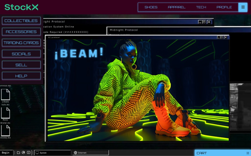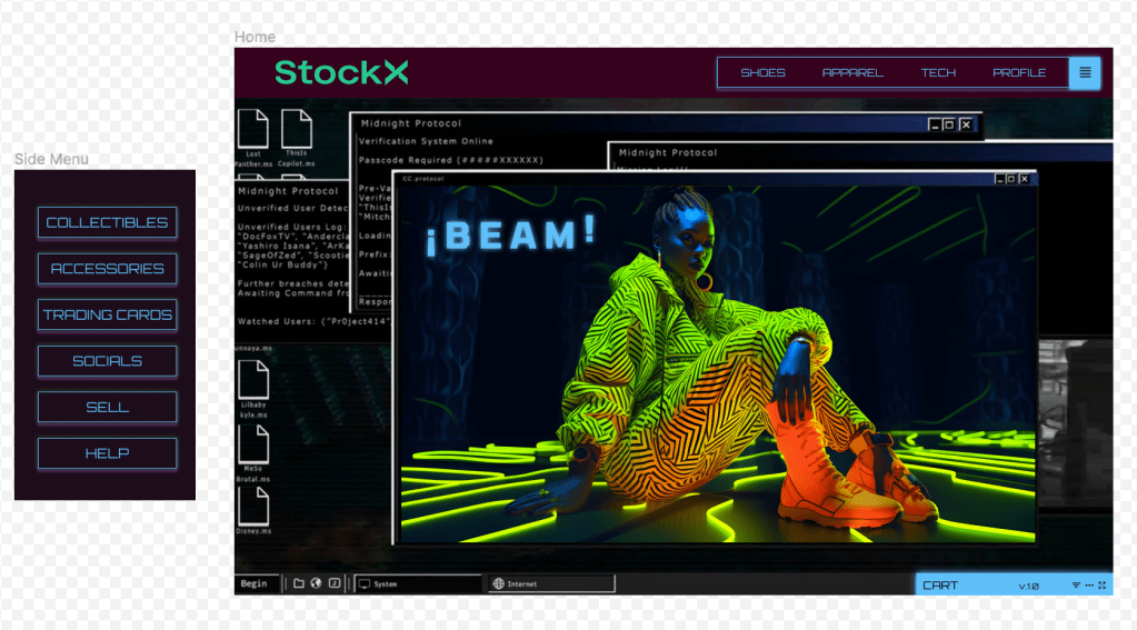 Results: I found this nostalgic OS mixed with trance look on Figma, and gathered other assets that fit the style, adjusted pieces in Illustrator and Photoshop, keeping a focus on hierarchy, considering the different UX/UI elements that guide us around the site, remembering my personal experience with resale websites, video games, sci fi, and 90s style, and then put it all together in Figma.