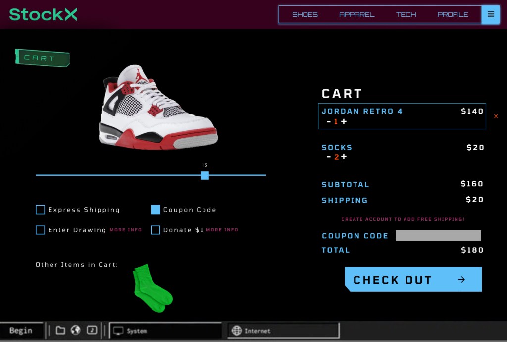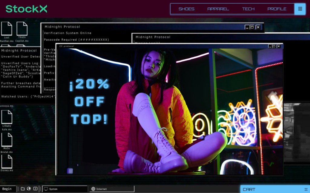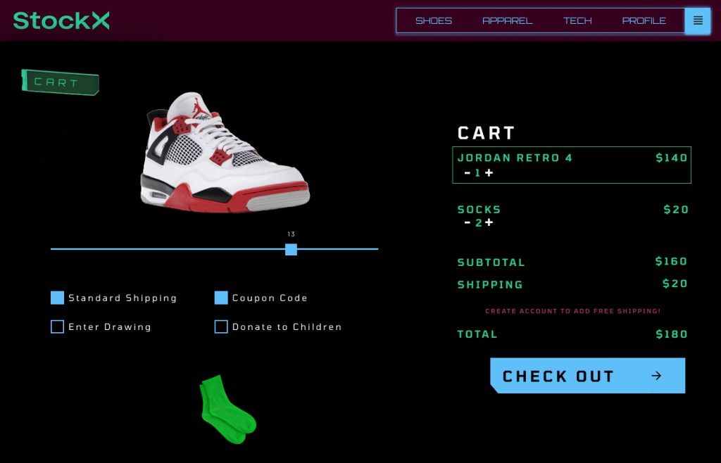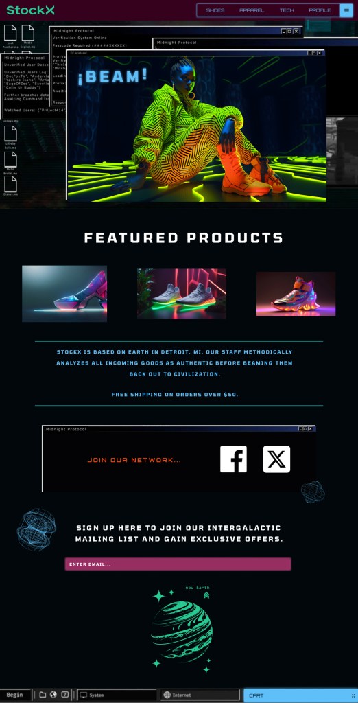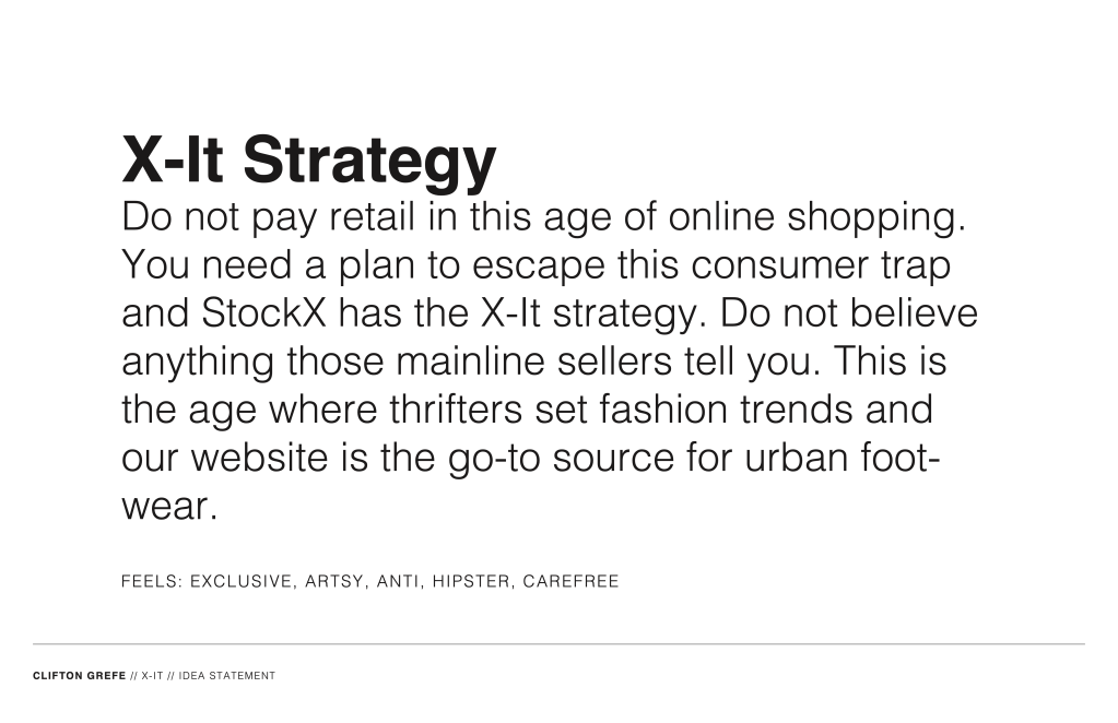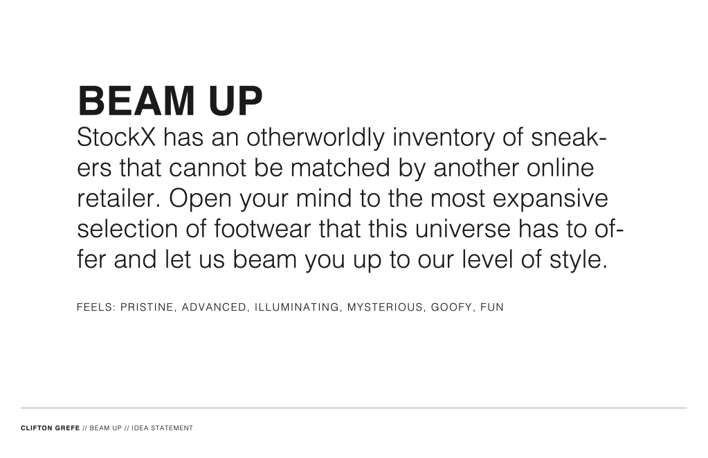 Pitch: StockX is an exciting concept but its site is white, blank, dull, and lacks character. That is not fashionable. My idea is to make it futuristic. They are not the first people to sell verified shoes online like this. There was PickYourShoes, for example. StockX, on the other hand, has received a considerable amount of (social) media attention. It is also similar to the name SpaceX. The aeronautics company has been in the news and should trigger some thoughts of outer space and advanced technology.