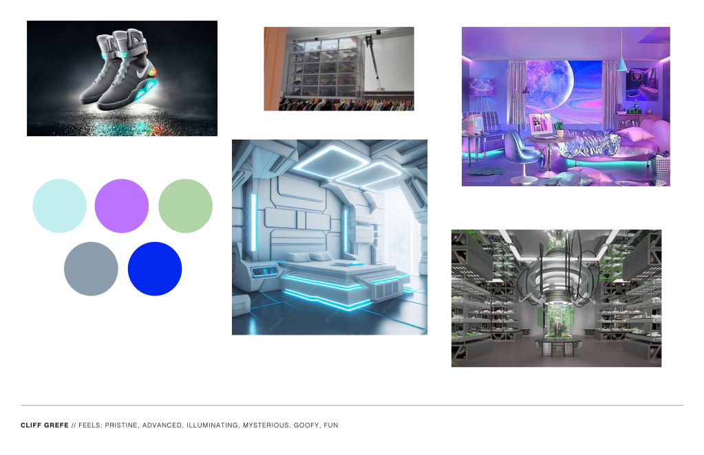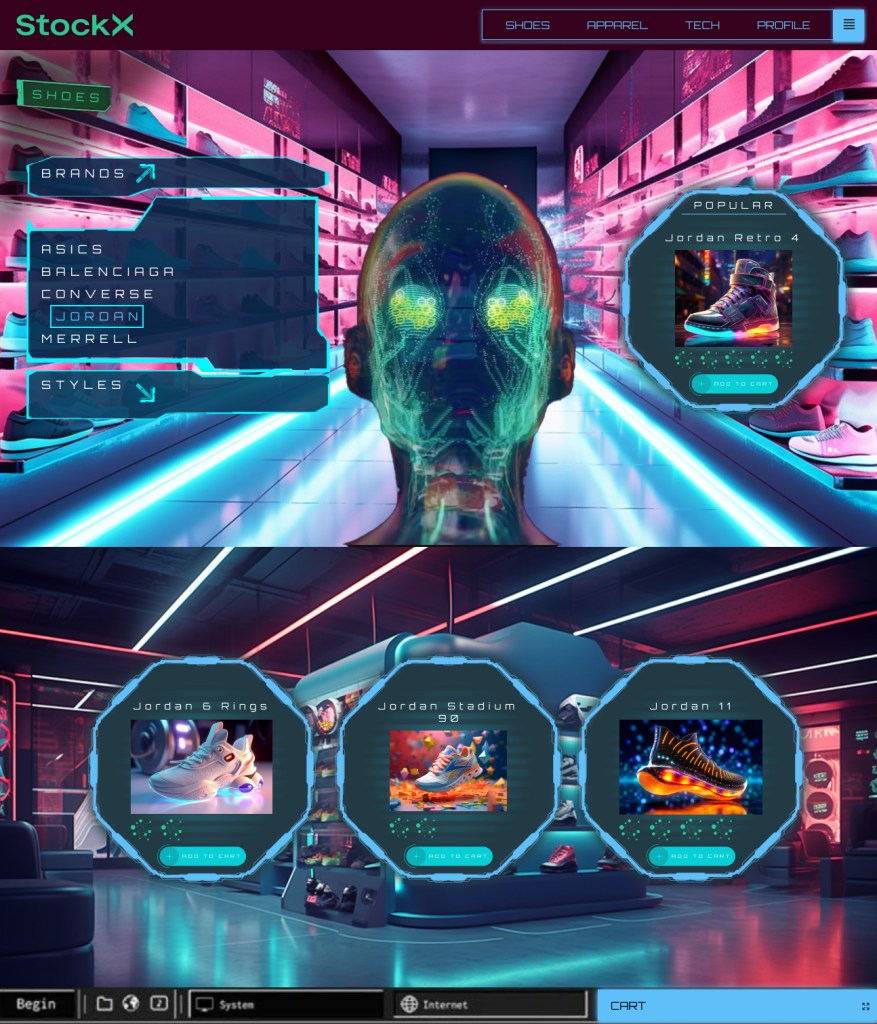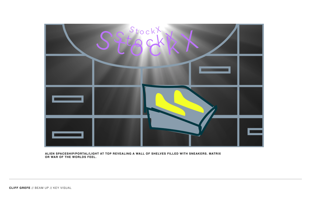 I generated two significantly different ideas to start, and decided on the futuristic look. The key image is a representation of a spaceship — that is somehow beaming down shoes from space into a compartmentalized shoe storage structure. As if shoes were the ultimate gift between intergalactic races or something. Or like StockX has a special relationship with our friends up there. Or shoes coming out of the bed of slime, disconnecting from The Matrix, like Neo does in the first movie.